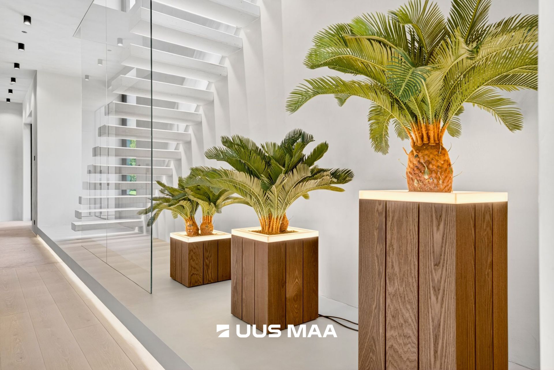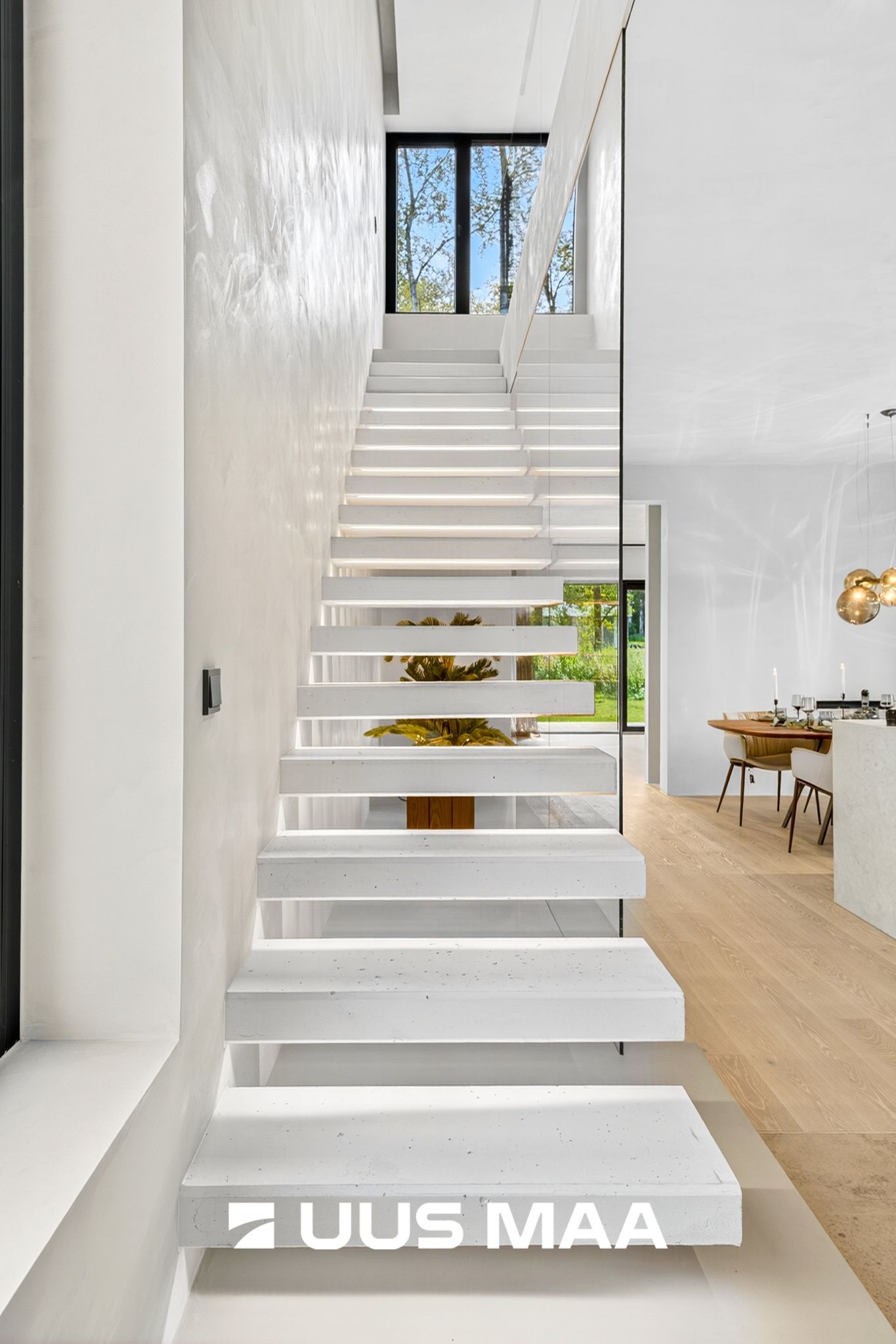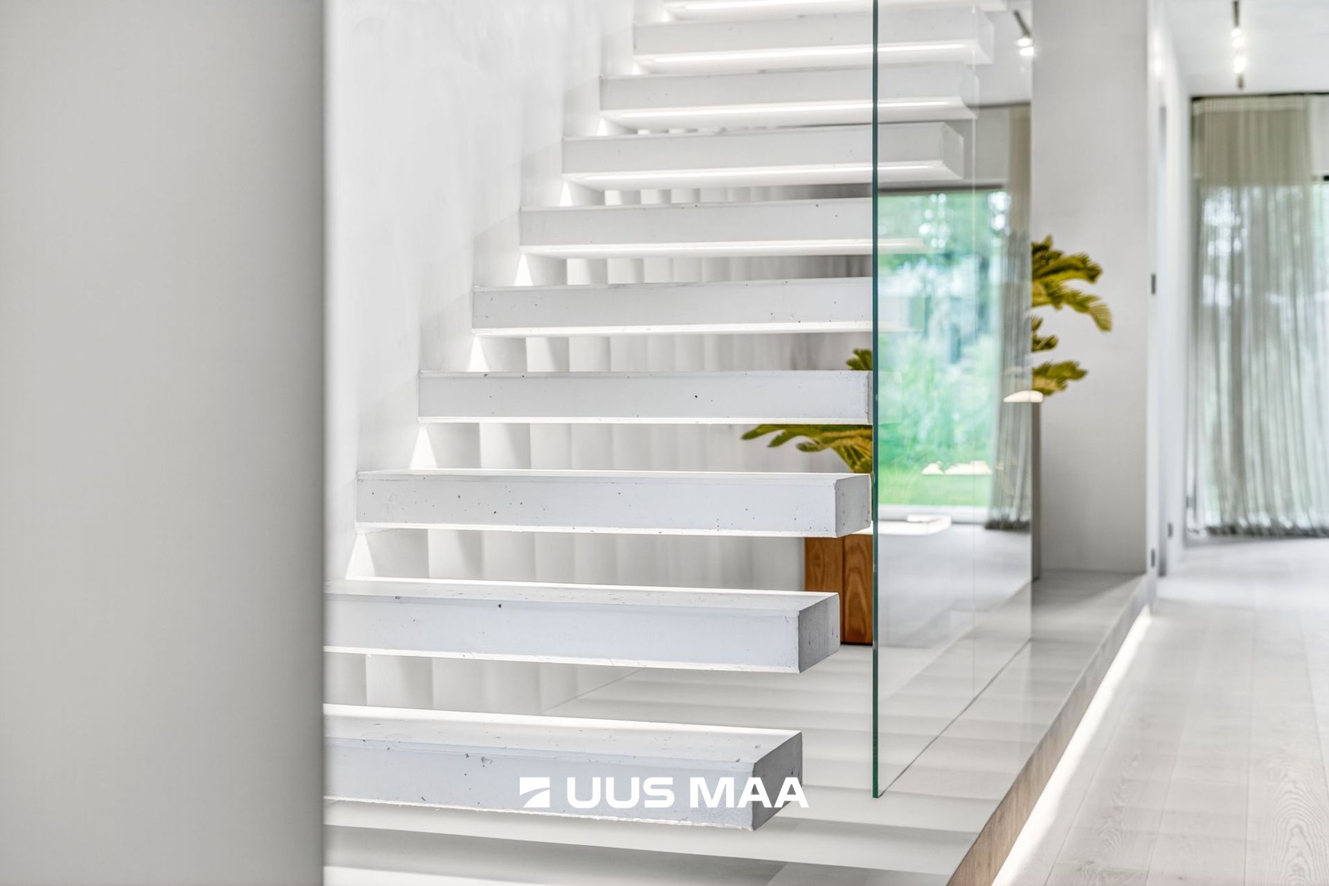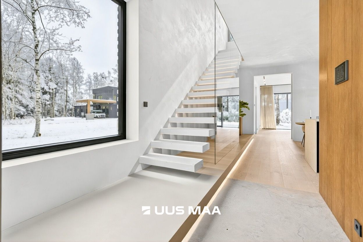 Valge betoonist hõljuv trepp eraldi valgustusega on kogu maja visiitkaart, mida võib kohata pigem rahvusvahelistes disainiajakirjades kui igapäevaelus.