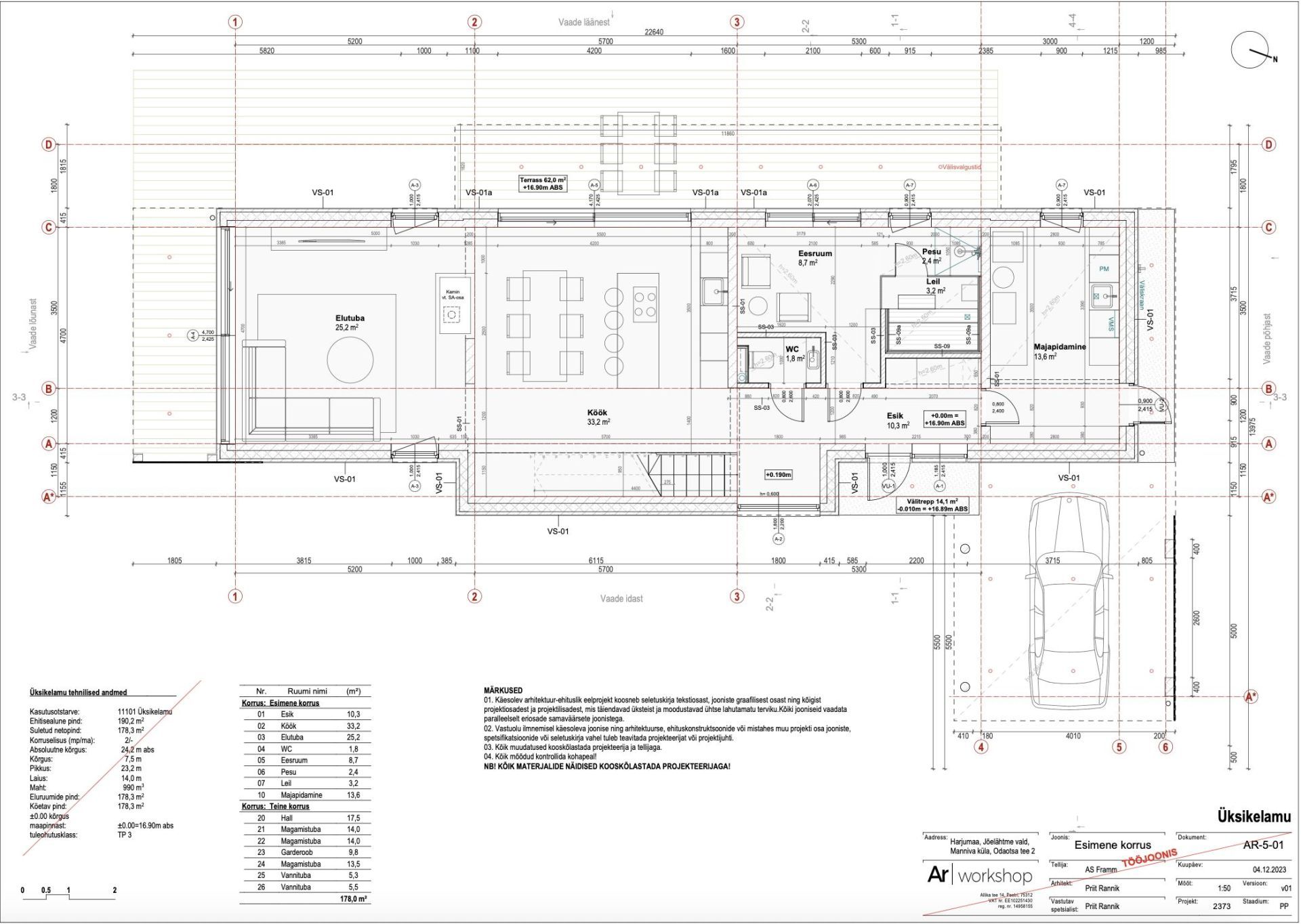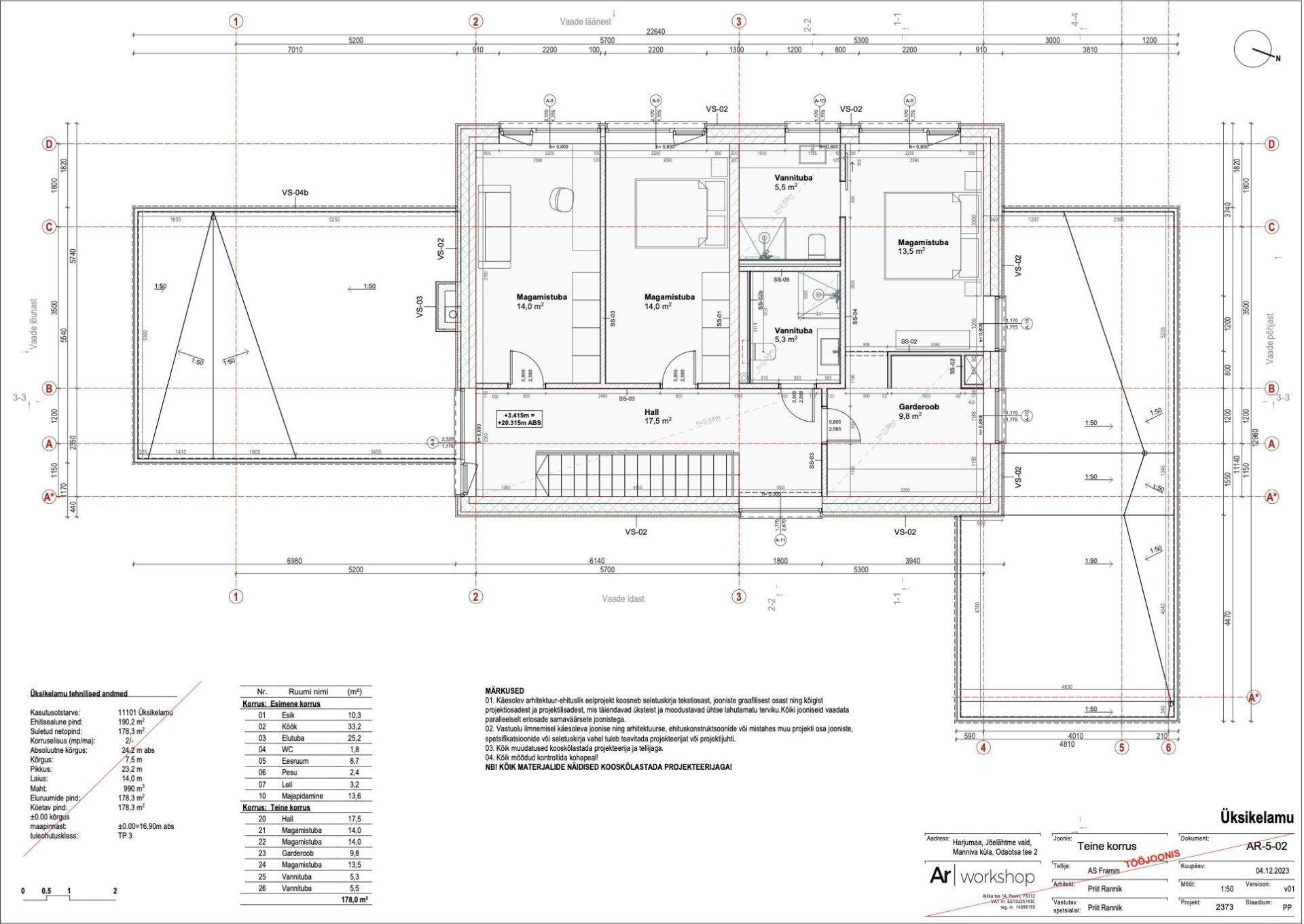 Villa on ehitatud madalvundamendile. Vahelagi on betoonist. Esimese korruse lae kõrgus on 2,8m. Teise korruse lae kõrgus 2,6m. Villa kõrgus 7.5m.