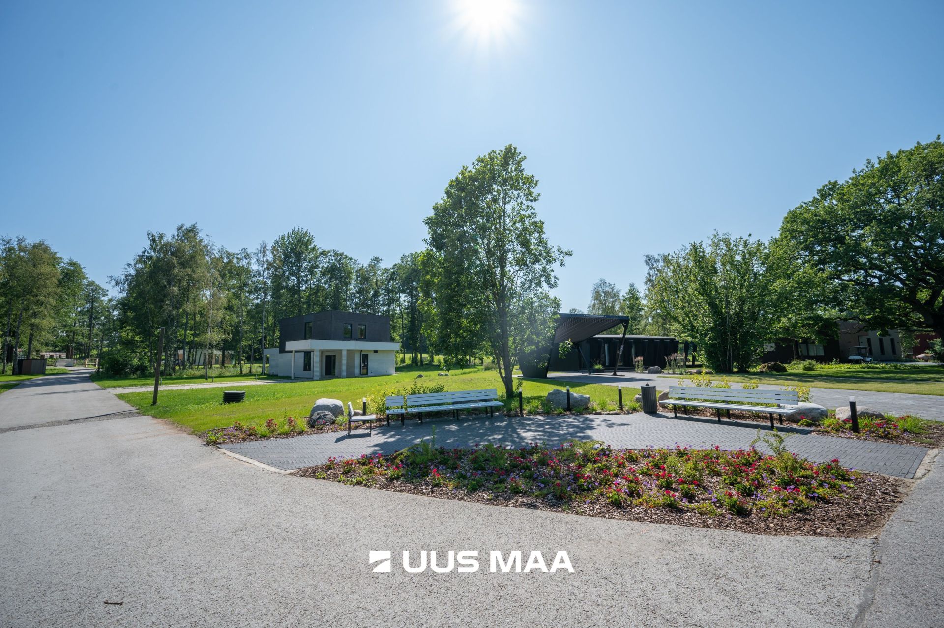 Parkimisala on samamoodi maitsekalt lahendatud. Disainsillutuskivid koos rohelahendusega loovad looduslähedase ja vaba mulje, samas pakkudes ruumi nii golfiautole kui igapäeva autodele.