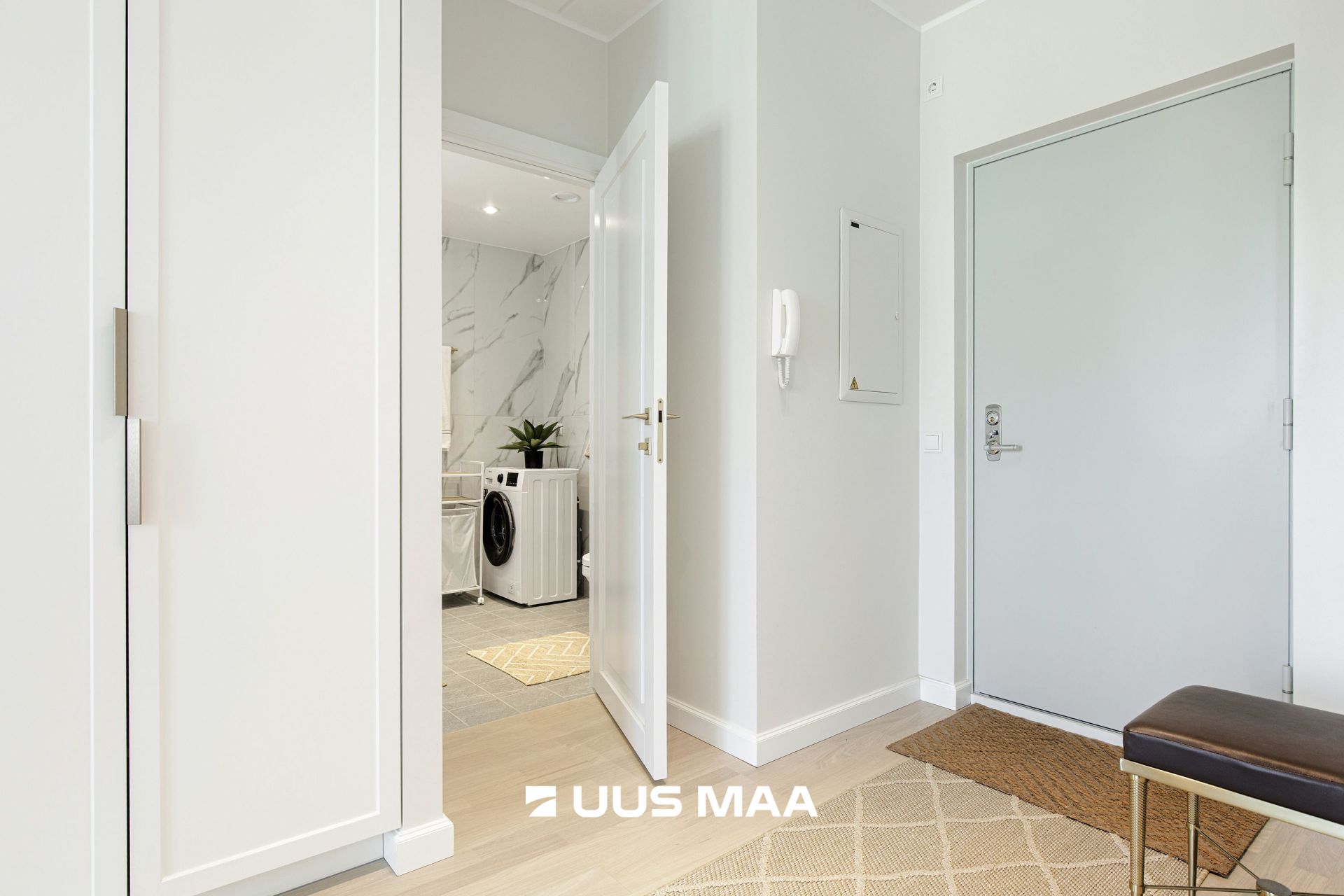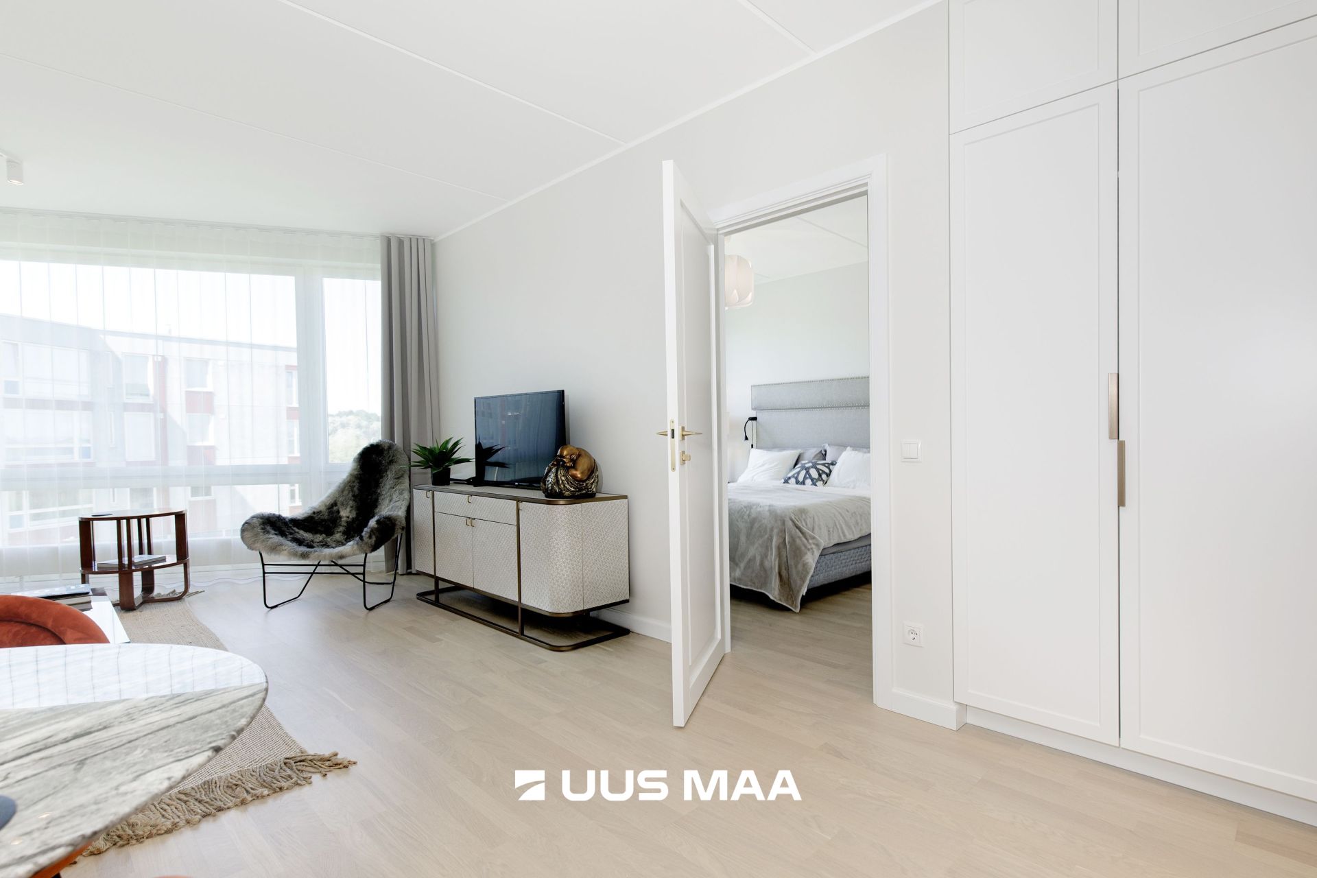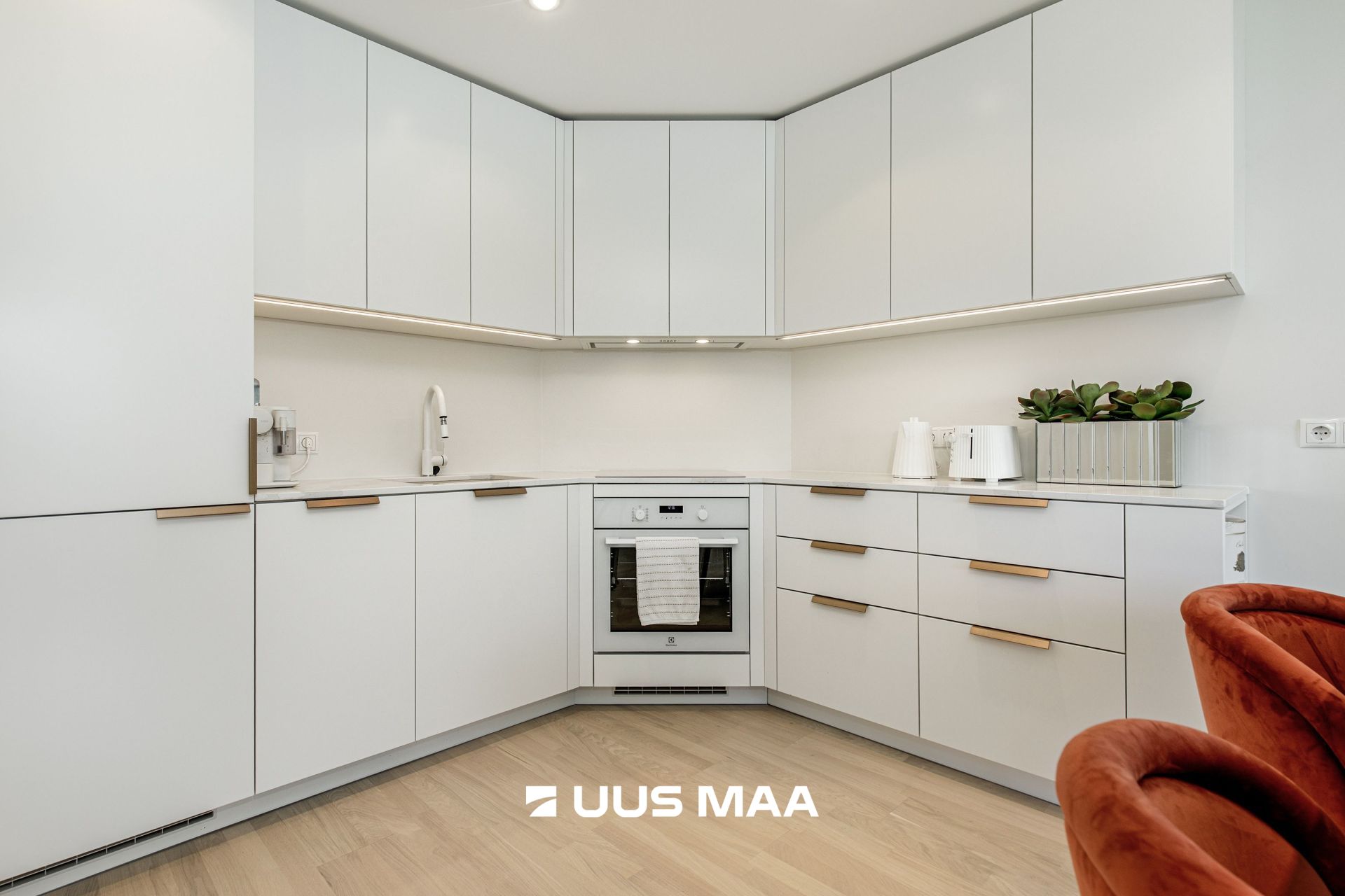 The apartment has been freshly finished using high-quality and premium materials – natural hardwood parquet floors, custom-made Idema kitchen furniture with a stone countertop, and spacious, built-in wardrobes in both the hallway and bedroom.