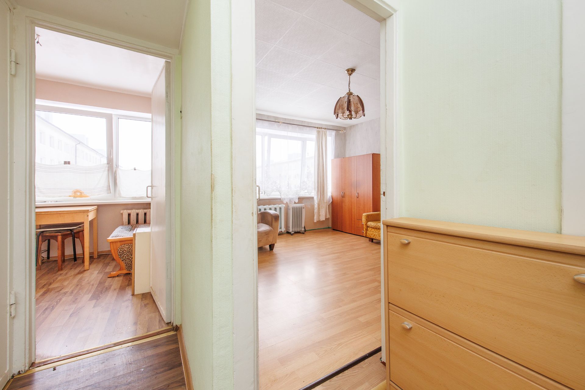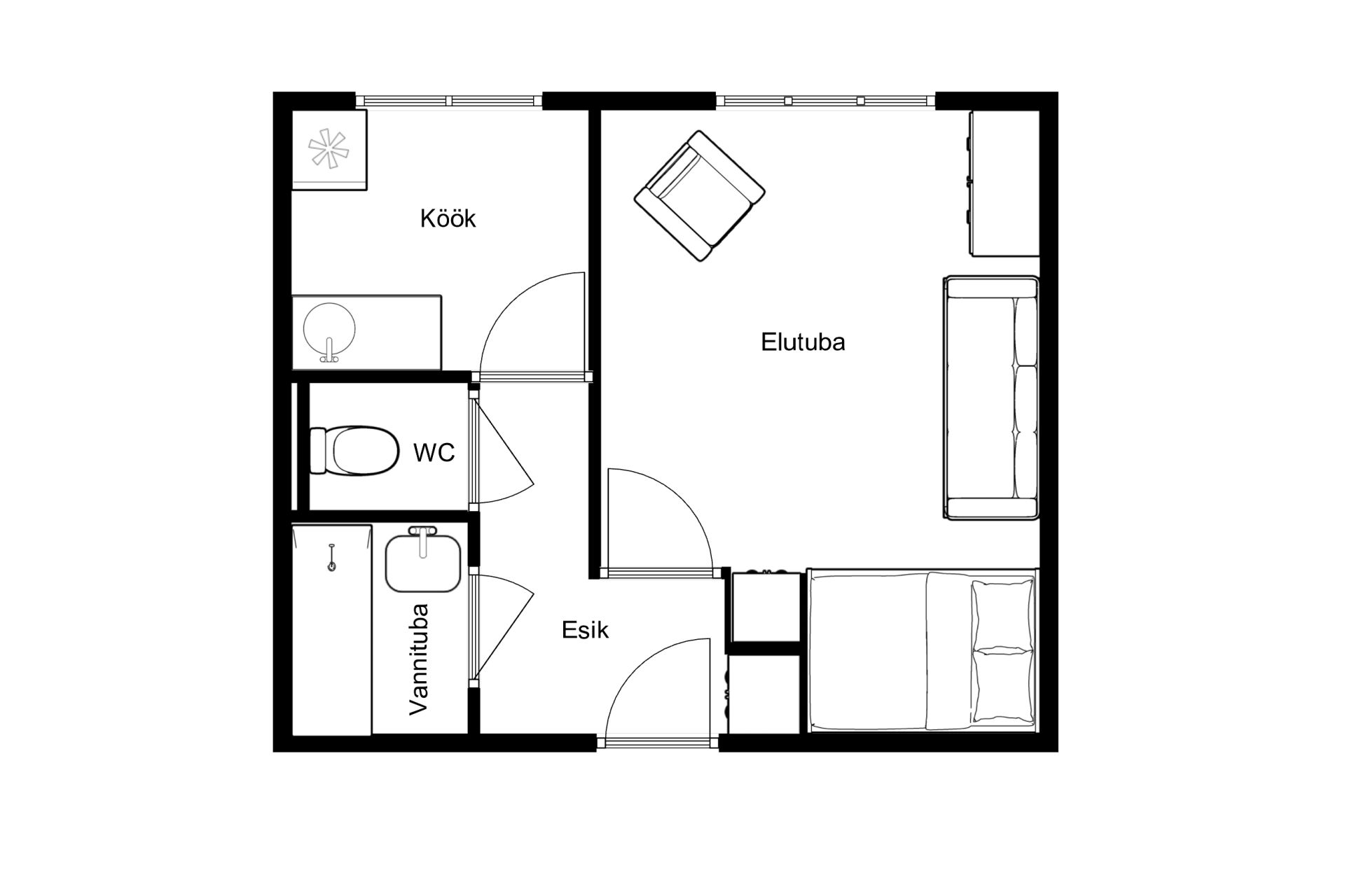 Korterisse sisenedes ootab Teid ees esikuala, mille vasakul käel asub vannituba ja eraldi WC. Otse paikneb eraldi asetsev köök. Paremale käele jääb elutuba.