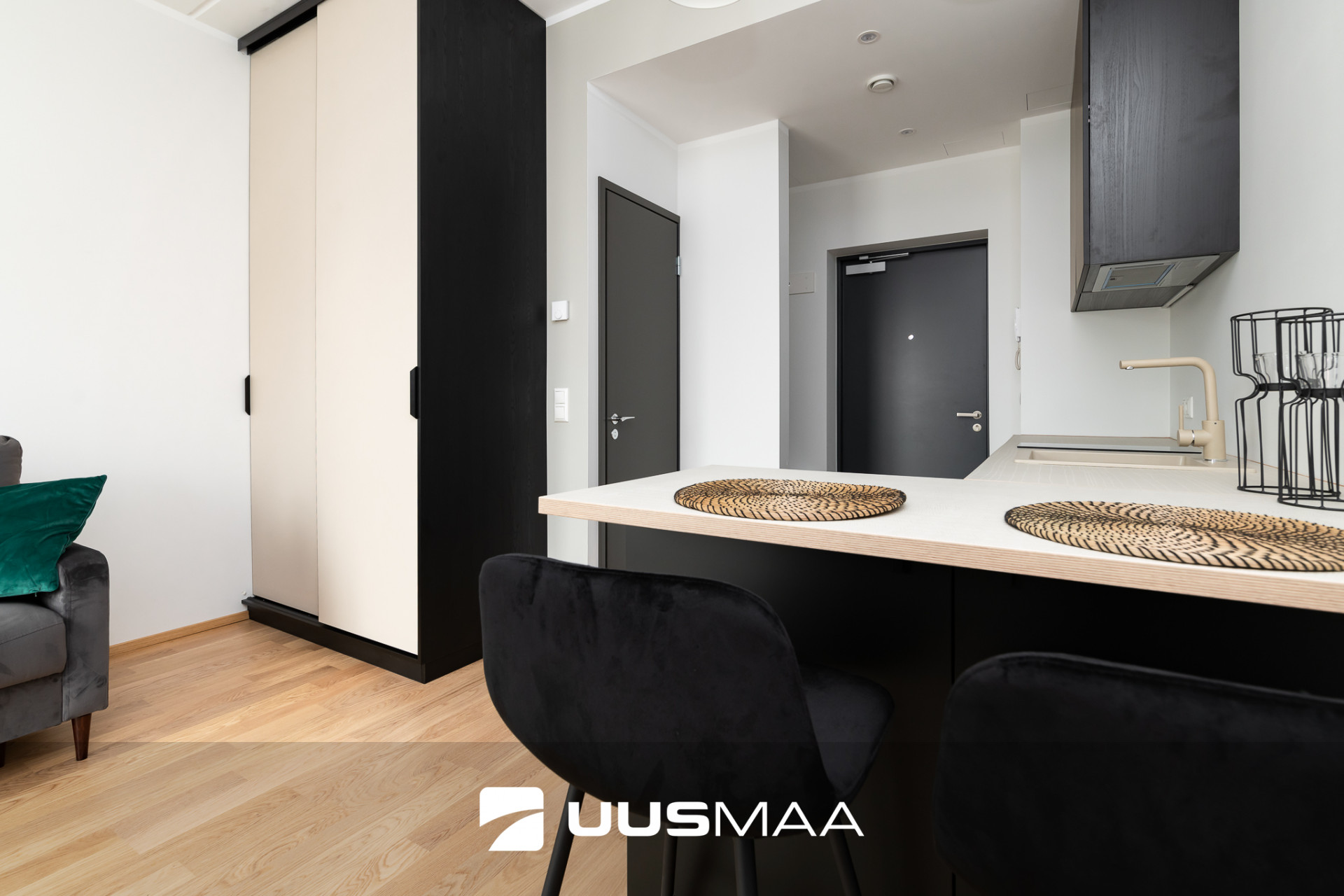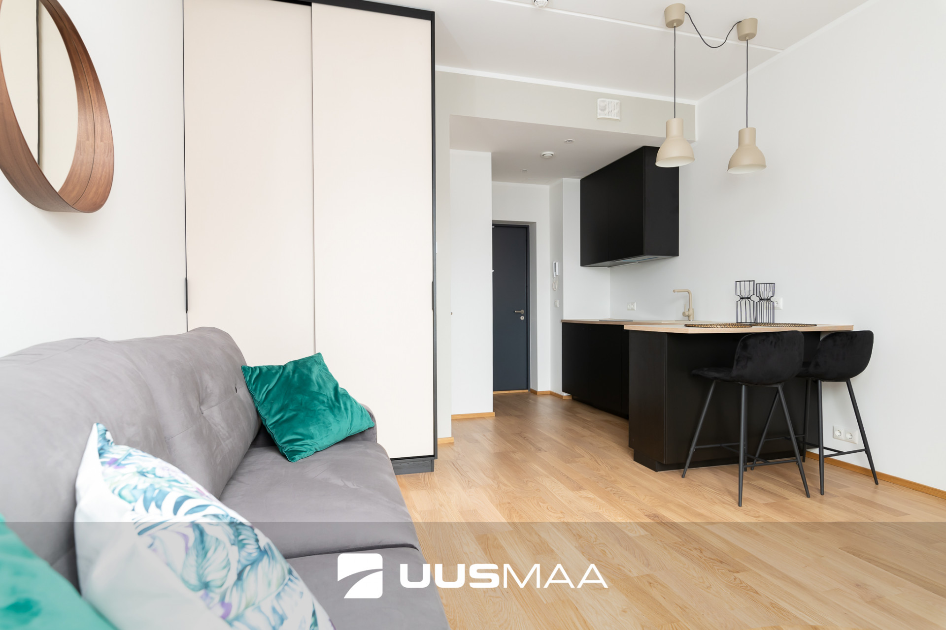 Hubane stuudiokorter antakse üürile piltidel nähtava mööbliga. Köögis on olemas pliit, kubu, külmkapp ning köögimööblisse on integreeritud ka pesumasin.