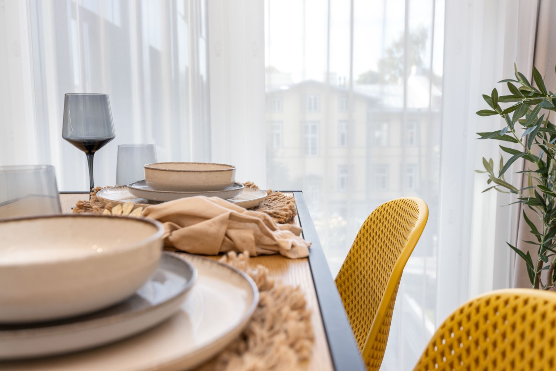 Akendest avaneb kaunis vaade renoveeritud puitarhitektuurile, rõhutades piirkonna ajaloolist ilu.