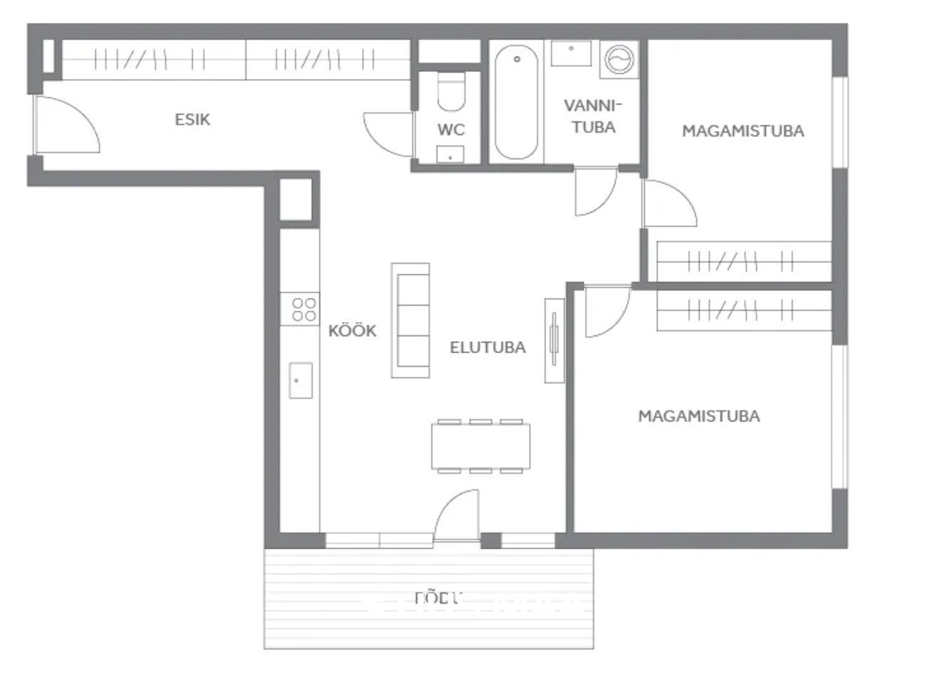 Avatud köök ja elutuba loovad avara olemise ning sealt pääseb ka 7,6 m² suurusele rõdule, kus saab nautida hommikukohvi või õhtuseid suvehetki. Köögis on eritellimusel valmistatud mööbel koos kogu vajaliku tehnikaga, mis jääb uuele omanikule. Kaks eraldiseisvat magamistuba annavad piisavalt privaatsust ja ruumi nii lastega peredele kui ka neile, kes vajavad eraldi töötuba või külalistetuba.